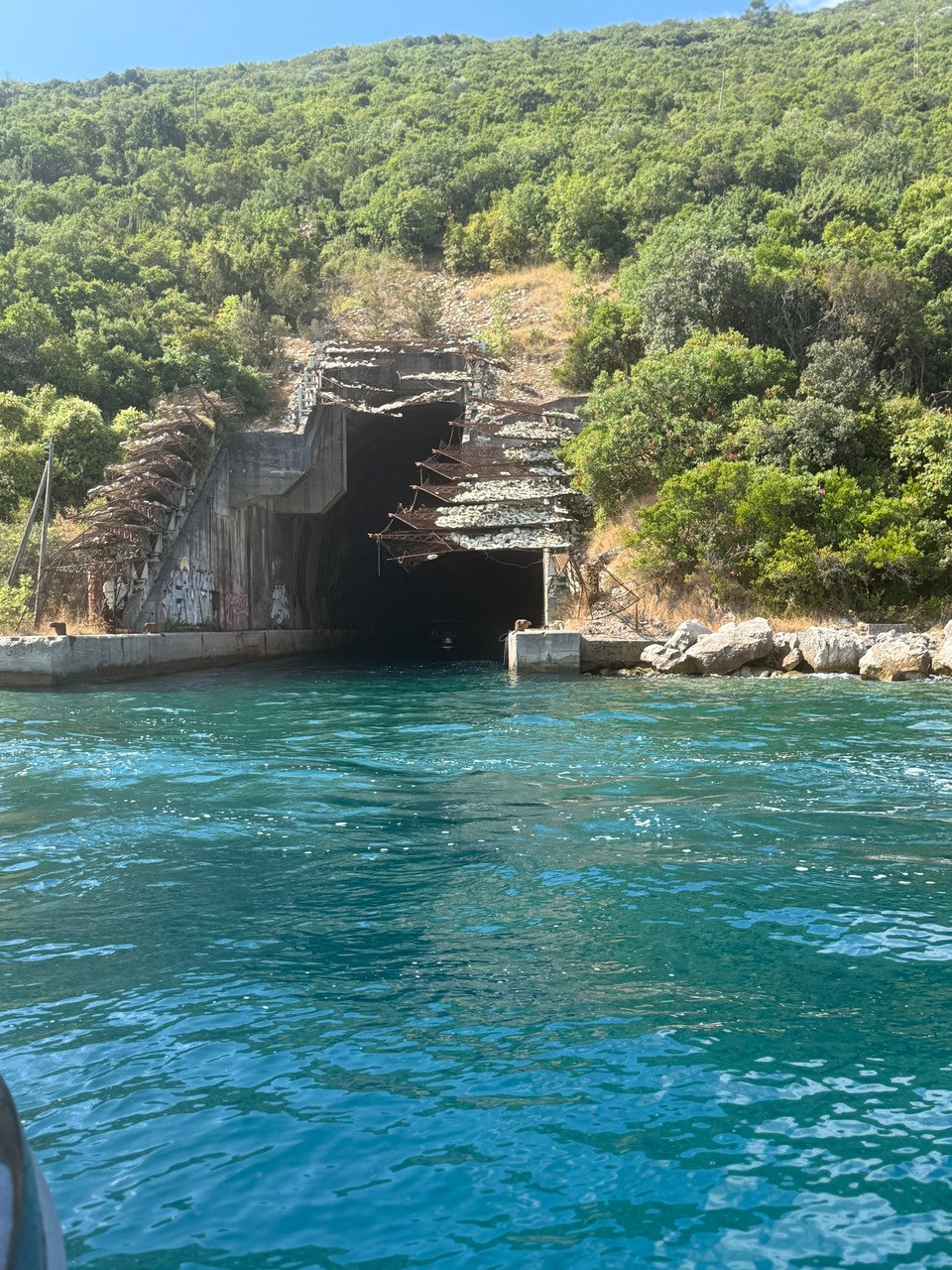 Continue your journey through the Bay of Kotor as you cruise from Our Lady of the Rocks to a hidden World War II-era submarine tunnel. Surrounded by dramatic cliffs and calm waters, this unique stop offers a glimpse into Montenegro’s secret naval history. - VISIT SUBMARINE TUNNEL (5min)